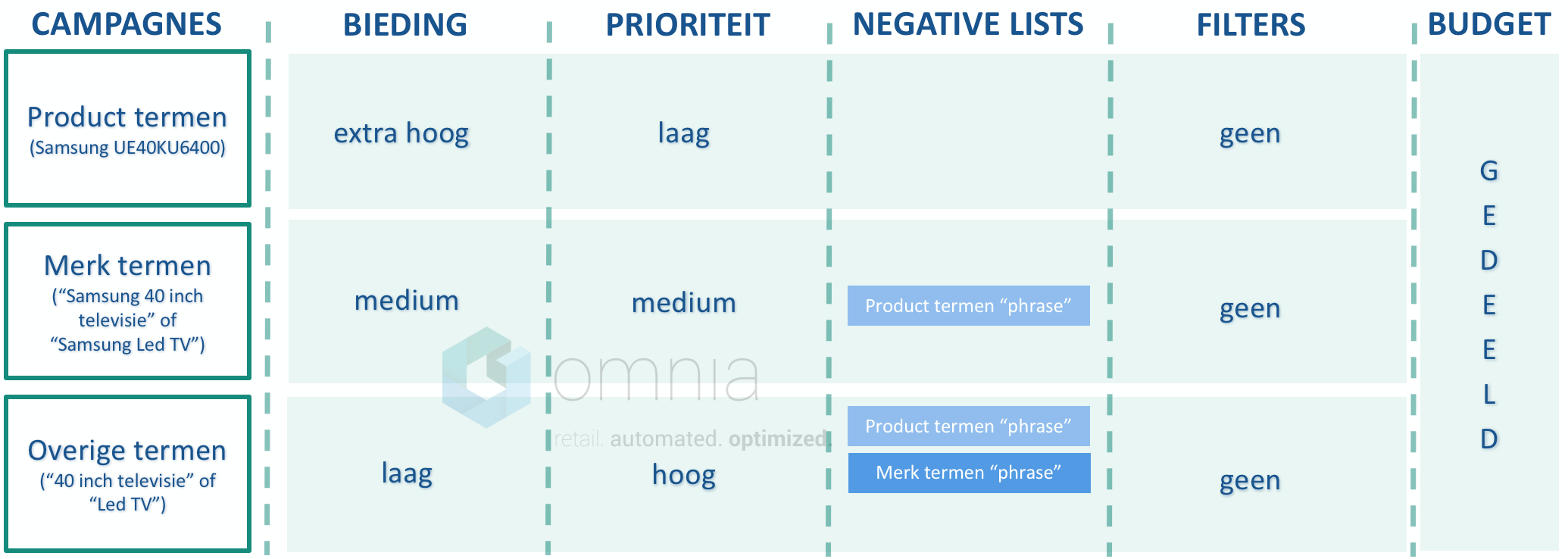 Laten we 3 zoekwoorden als voorbeeld nemen: “Led televisie”, “Samsung led televisie” en “Samsung UE40KU6400”. Google Shopping probeert eerst alle 3 de zoektermen op de campagne met de hoogste prioriteit te serveren: de "Overige termen" campagne. De "Led televisie" zoekterm kan hierop geserveerd worden, maar de andere twee termen bevatten de merknaam Samsung, die voorkomt in de negatieve zoekwoordenlijst. Deze zoektermen kunnen dus niet geserveerd worden en gaan door naar de campagne met medium prioriteit: de "Merk termen" campagne. De zoekterm "Samsung led televisie" kan hierop geserveerd worden, maar de zoekterm "Samsung UE40KU6400" bevat de product term UE40KU6400, die op de product termen negatieve zoekwoordenlijst staat. Dit zoekwoord gaat daarom door naar de "Product termen" campagne, waarop die geserveerd kan worden.