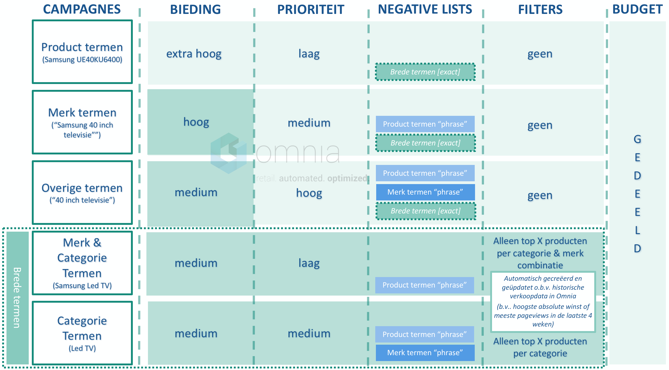 (Let op dat je ook de product termen als negatieve zoekwoordenlijst moet toevoegen aan de brede campagnes, aangezien de product termen campagne een lagere prioriteit heeft).