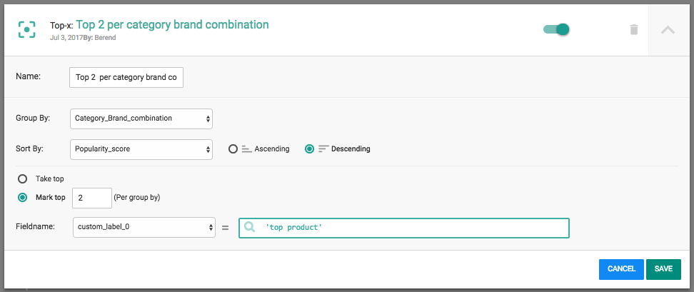 Op basis van deze populariteitsscores kan voor elke groep een Top X (b.v. Top 2 of Top 5) gemarkeerd worden door er een label aan toe te wijzen. In de Adwords Google Shopping campagne settings kan je alleen de producten filteren met dit label. Op die manier laat je alleen de meest populaire producten per categorie door in de Categorie termen campagne en de meest populaire producten per Merk & Categorie op de Merk & Categorie termen campagne.